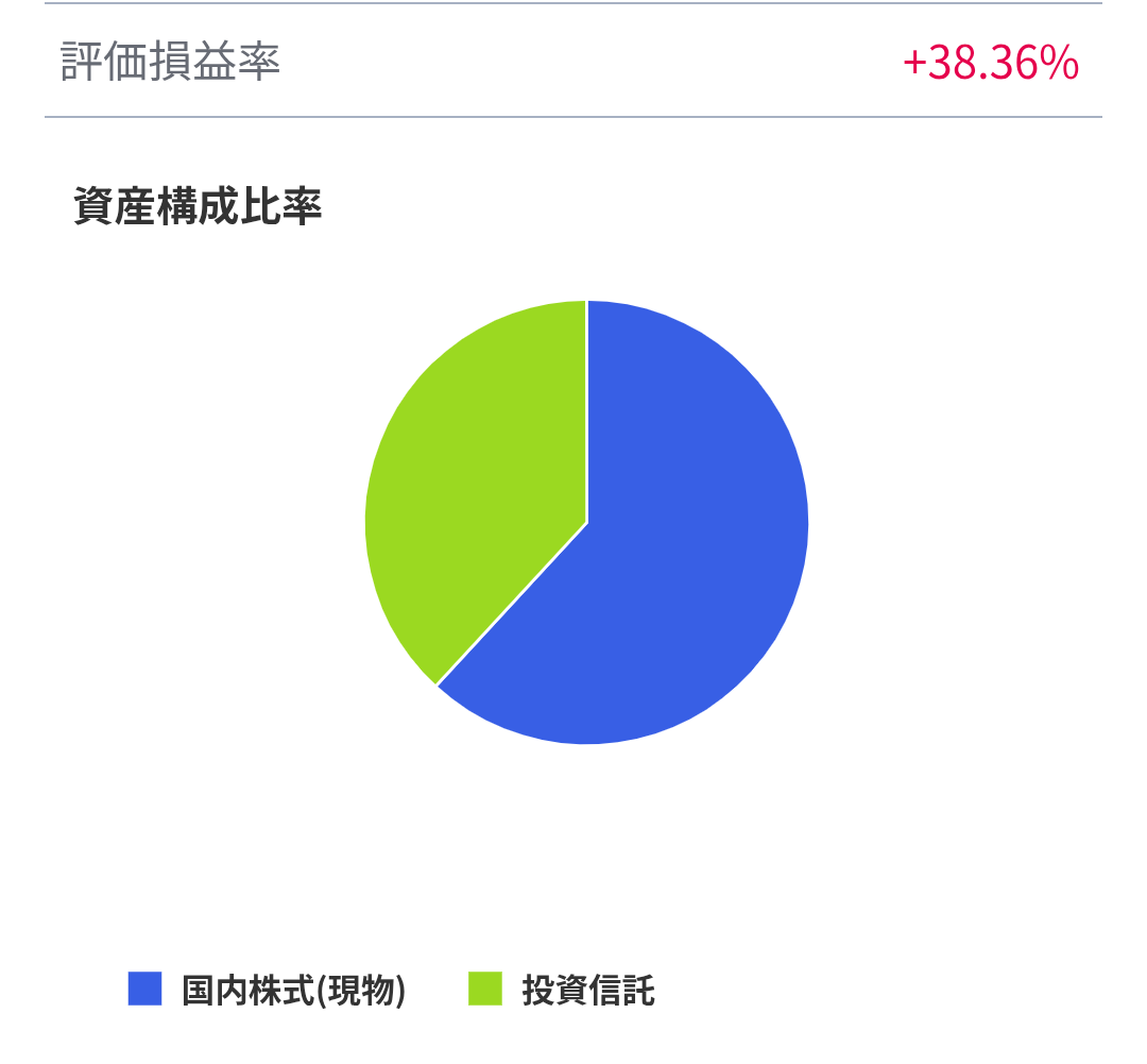国内株式 60% / 投資信託 40% という比率で、市場平均を上回るリターンを維持しています。